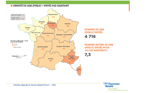 Ceci est à mettre en relation avec la densité des laboratoires privés en 2019 estimée à 5.8 / 100 000 habitants en 2019, une densité qui a tendance à croitre ces dernières années, principalement du fait de la recherche concurrentielle de parts de marché par les grands groupes.