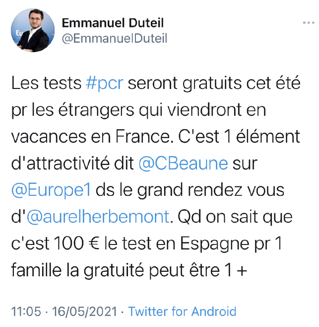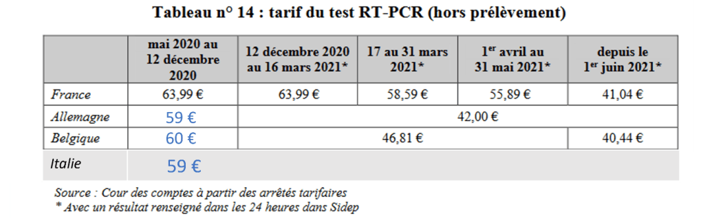 Ce n’est qu’à partir de juin 2021 que la tarification des tests RT-PCR a été ramenée à un niveau comparable à ceux des pays voisins. Si le ministère de la santé avait appliqué dès décembre 2020 le tarif fixé au 1er juin 2021, proche de ceux en vigueur en Allemagne ou en Belgique, l’assurance maladie aurait pu réaliser une économie de l’ordre de 800 millions d’euros (estimation Cour des Comptes, rapport d’octobre 2021) qui identifie avec pertinence la cause de ce décalage.