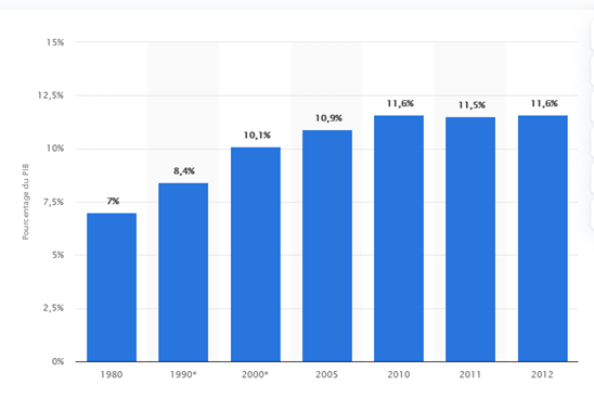 Total des dépenses consacrées à la santé en pourcentage du Produit Intérieur Brut (PIB) ; France ; entre 1980 et 2012 (source)