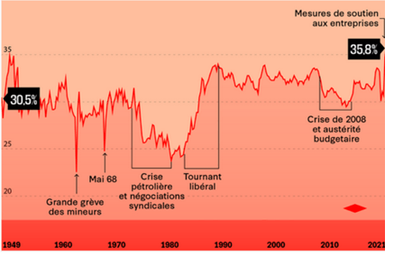 Depuis les années 80, le taux de marge brut des entreprises a retrouvé le niveau d’après-guerre pour se maintenir autour de 30%. En 2021, celui-ci s’est envolé à son plus haut niveau depuis 1949. En cause ? Les importantes aides aux entreprises (10% du PIB, chômage partiel, compensations multiples…), le rebond de l’activité post crise Covid, la baisse des impôts de production.